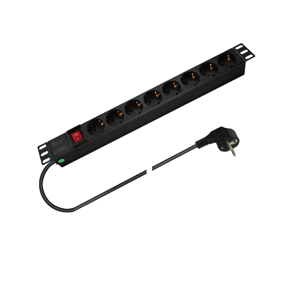 19"/1U 8-osainen pistorasiapaneeli kytkimellä, 2m kaapeli